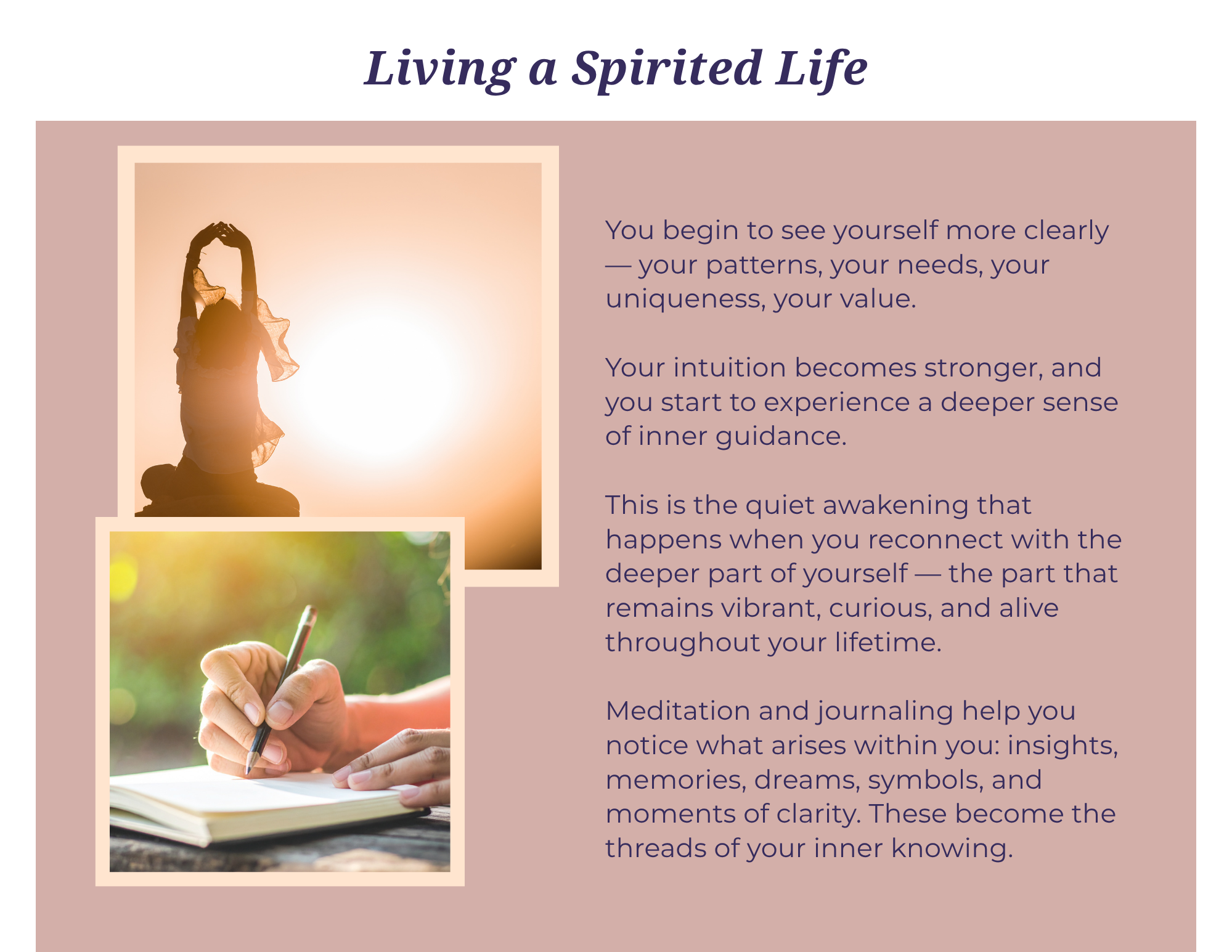 Making time to connect with spirit. Walking in nature, feeling the sun on your skin, breathing in fresh air helps us keep in touch with our true nature. The peace alone helps to restore us.