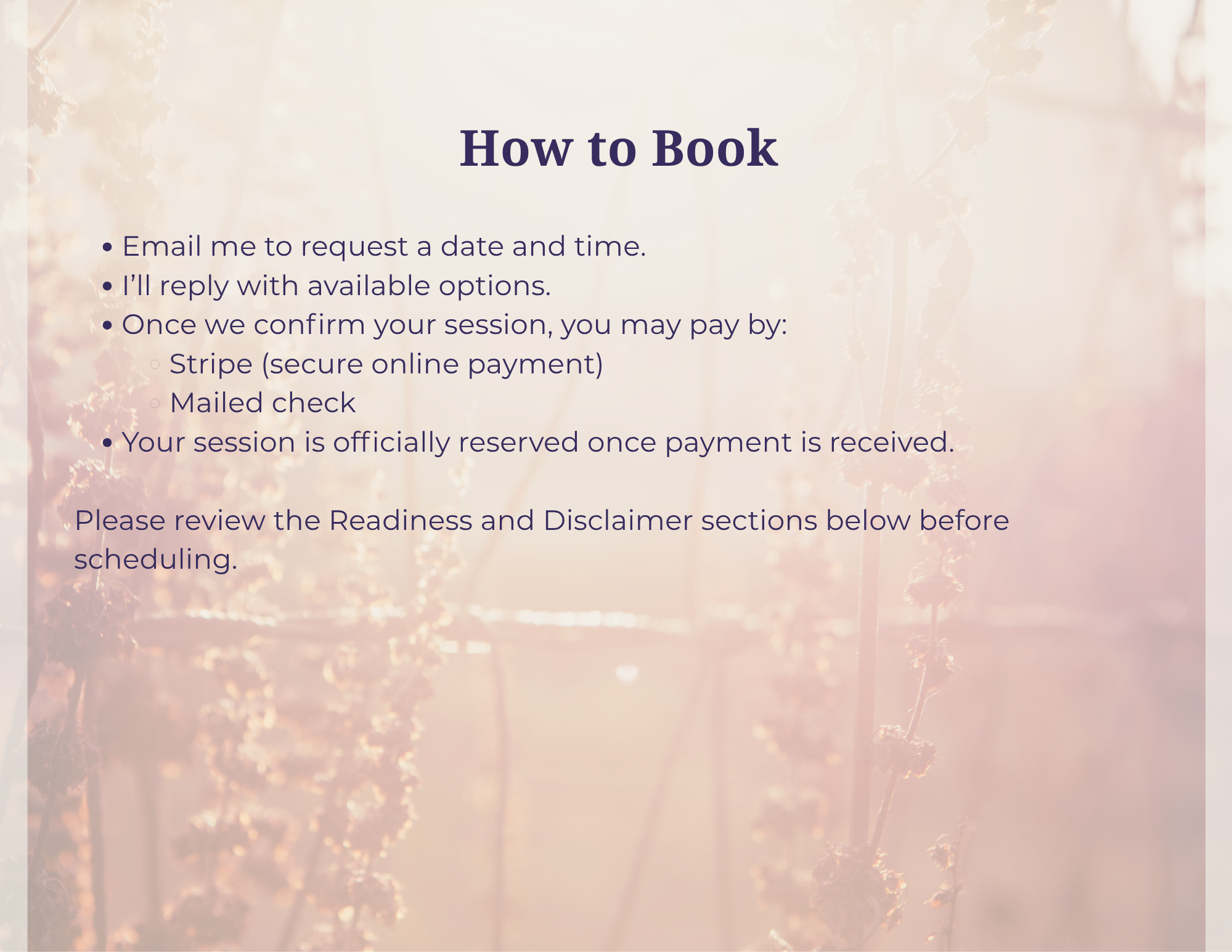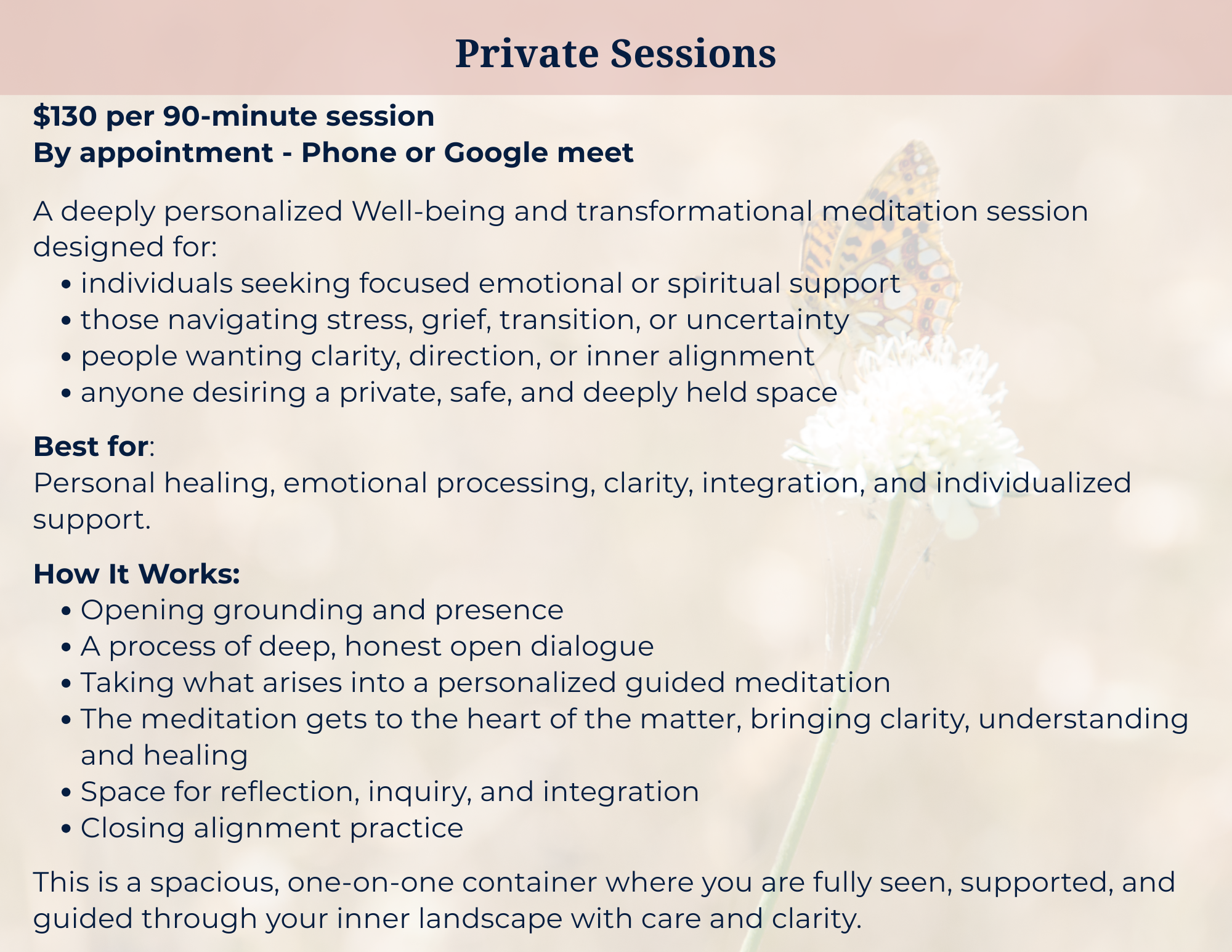 Experiences and results vary by individual. Participation is voluntary, and you are encouraged to honor your body and mind throughout the sessions. By engaging with these offerings, you acknowledge responsibility for your well‑being and understand that no specific outcomes are guaranteed.